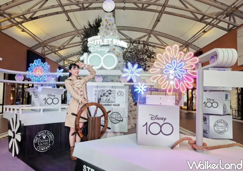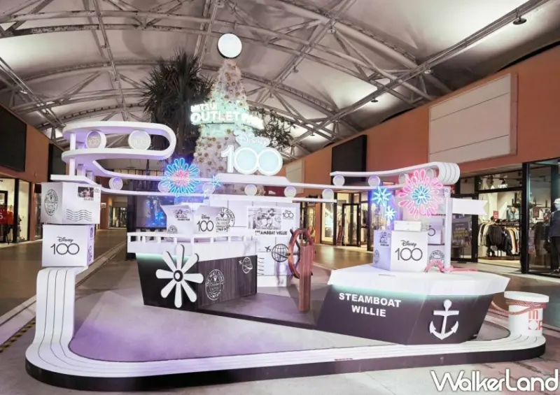 台中港三井OUTLET則是以郵票為主題,集結迪士尼、皮克斯、漫威、星際大戰系列,打造出翻玩復古經典的「夢想典藏」打卡點。現場直接將迪士尼首部有聲動畫場景復刻呈現的「百年世紀」,在5米高藍白聖誕樹下,將經典威利汽船造景首航進台中港。![]()