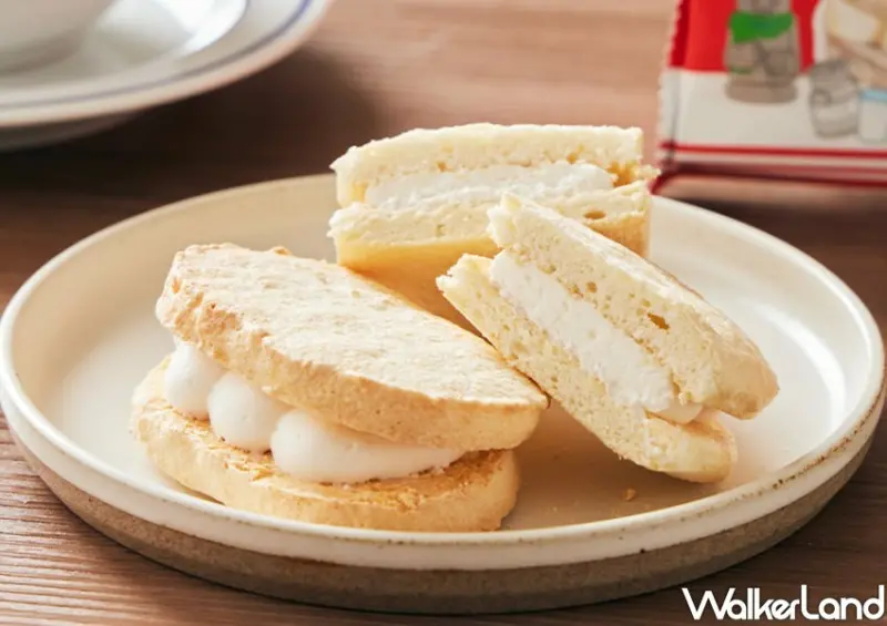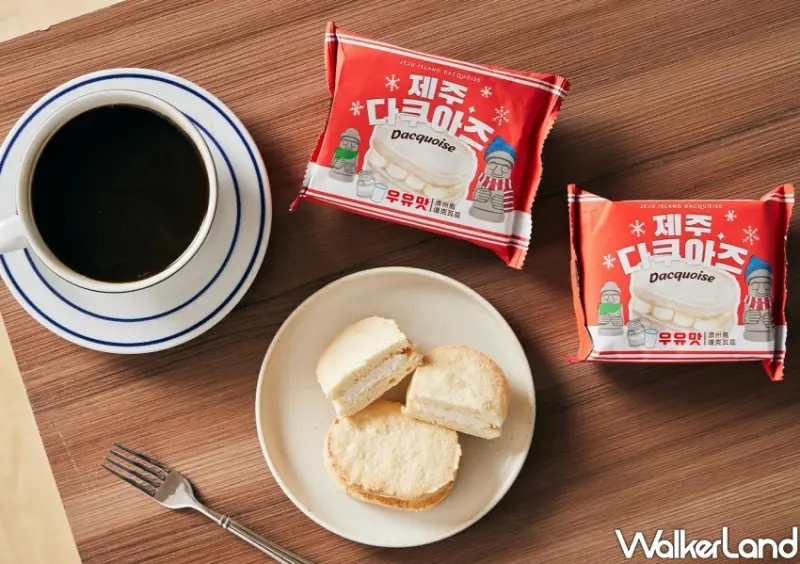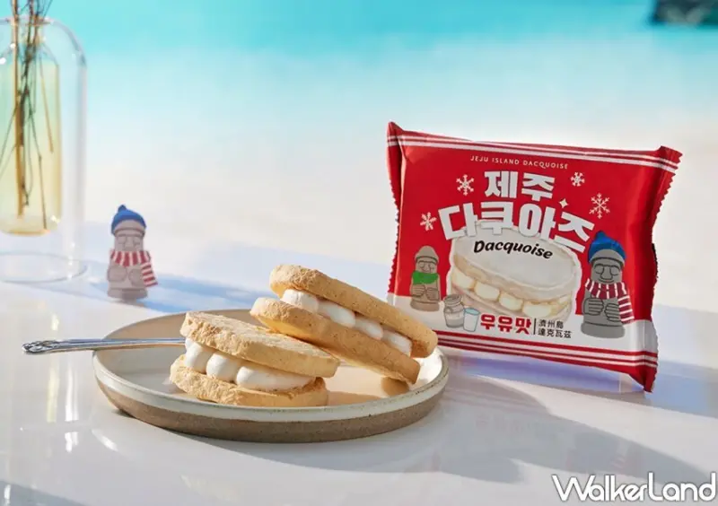 源自於法國西南部小鎮的傳統甜點「達克瓦茲」,流傳到日本後經過改良變成橢圓型小點心,外層蛋糕體使用大量蛋白、杏仁粉和糖粉製成,中間擠上一圈圈牛奶醬擠花,搭配外酥內蓬鬆的達克瓦茲蛋糕,便是最療癒的「濟州島達克瓦茲」。外包裝以濟州島招牌石頭爺爺圍著圍巾在雪地中呆坐的模樣,也超可愛療癒。