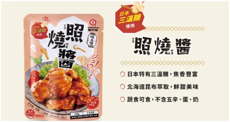 龜甲萬擁有三百多年歷史,今年,首次在台灣開發醬油以外調味品,以最具優勢的道地和風出發,複製日本市場的成功經驗,開發出五款最受日本家庭喜愛的產品口味上市。根據日本龜甲萬母公司市調部資料顯示,日本龜甲萬憑藉21年的調味醬包開發經驗,已在日式料理類別中佔據市場NO.1的地位。![]()
