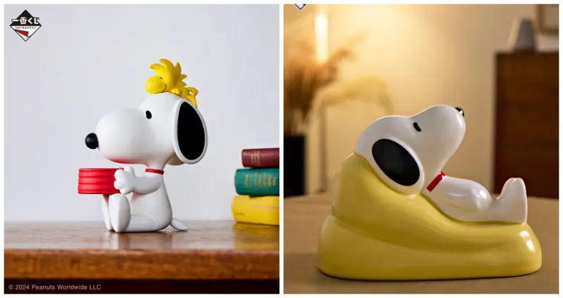 最令人期待的A賞是可愛俏皮的「史努比公仔置物盒」,除了能夠收納飾品、小文具以外,直接拿來當公仔擺在辦公室或房裡,都讓人覺得相當療癒;B賞則是陶製的「史努比存錢筒」,慵懶的史努比仰躺在懶骨頭沙發上的模樣,在讓粉絲養成儲蓄習慣的同時,同樣也可以做為公仔裝飾家中的角落。