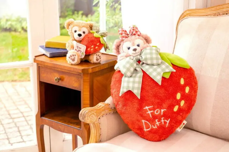 在這一波粉粉嫩嫩的草莓系周邊當中,官方最主打的就是能夠讓玩偶享受裝扮樂趣的「動物服裝」,如果你有購買達菲熊家族的大尺寸娃娃,就可以讓它們穿上含有豐富草莓元素的新衣,例如傑拉多尼的服裝是含有草莓領結與草莓吊帶褲的套裝、雪莉玫則是草莓蝴蝶結頭飾以及格子洋裝。除此之外,還有草莓造型的大型抱枕,上面還有一隻雪莉玫娃娃,可可愛愛的模樣,拿到辦公室使用,回頭率保證超高。