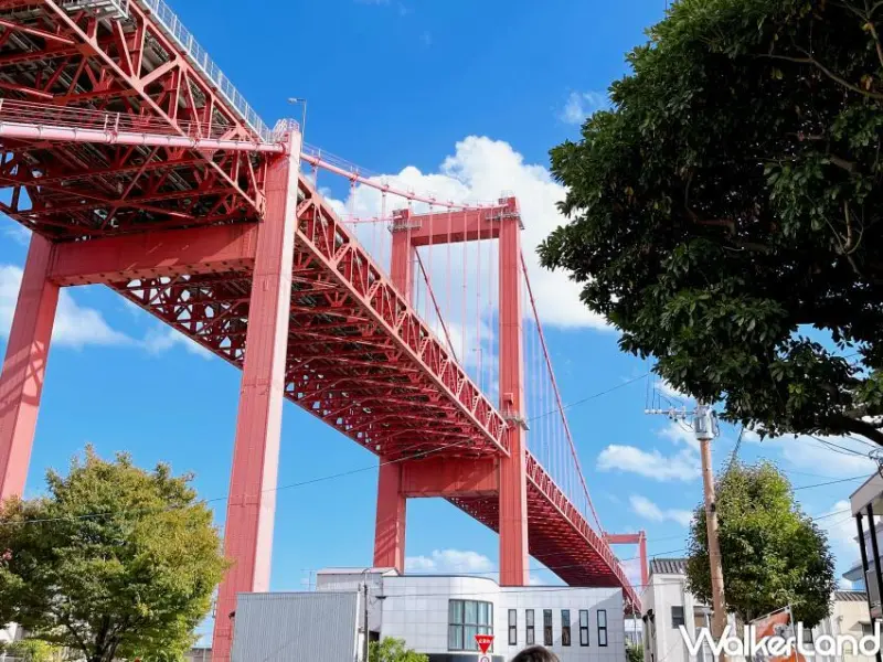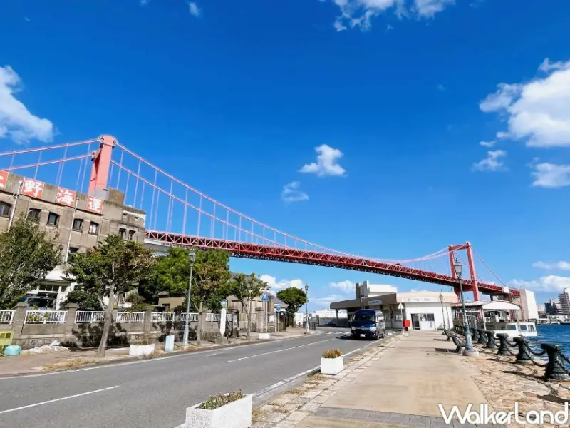 北九州市若松町的「若松南海岸道」,是一條富有懷舊風格的散步大道,這裡最明顯的地標就是全長627公尺的鮮豔紅色吊橋「若戶大橋」,若戶大橋是連結戶畑區和若松區的巨型橋樑,1962年完工時還被稱為「東洋第一的夢幻大橋」,更成為了後來瀨戶大橋、明石海峽大橋、關門橋等日本知名大型長吊橋的先驅。
