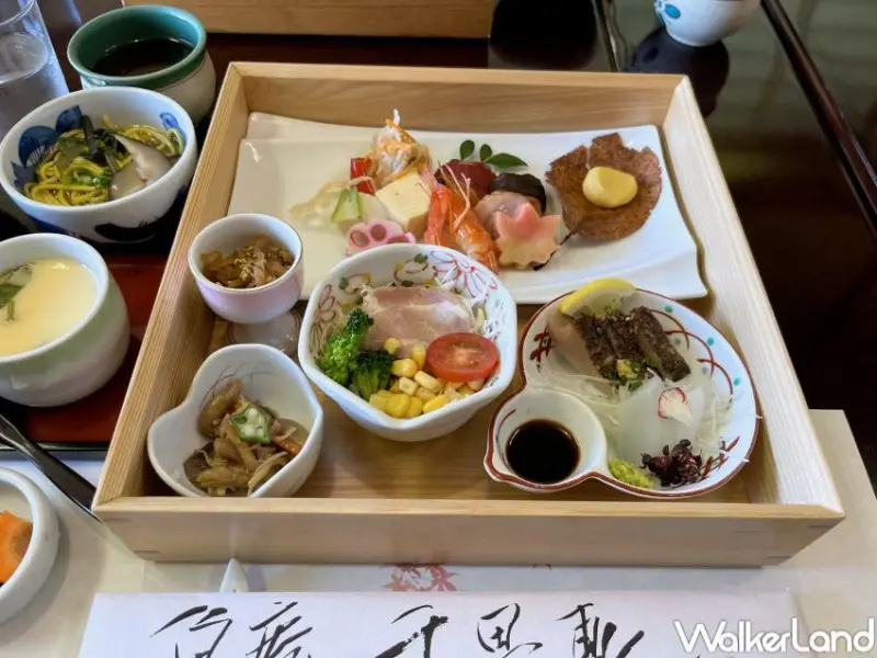 雖說「魚庵 千疊敷」平常於上午11點30分開始營業,但午餐提供時間為11點至下午2點,所以如果想要享用午餐的話,就可以早一點到現場入座,而且最便宜的「千疊敷午間套餐」含稅只要1,980日圓就能吃得到,餐點包含麵食、茶碗蒸、沙拉、生魚片、各式綜合小菜、湯品、白飯等,且都用精緻的木盒裝好,既漂亮又美味,CP值可謂相當高。
