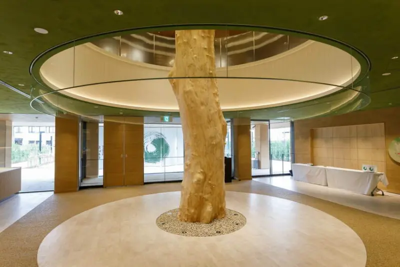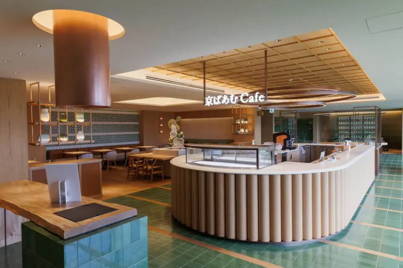 來到「atelier京ばあむ」除了吃吃喝喝與爆買伴手禮之外,這裡的建築物也是亮點之一,從樓梯、牆壁、地板、洗手間、天花板到館內通道,都悄悄加入了抹茶或年輪蛋糕的元素,相當令人驚豔!像是從1樓延伸至2樓的8公尺高七葉樹,正是以館內人氣伴手禮之一的「七葉千層派」為靈感所打造,而通往3樓的階梯設計,也會讓人覺得自己彷彿在年輪蛋糕裡行走般新鮮有趣,還有四處可見的綠色牆壁及綠色磁磚,都讓人聯想到與京都淵源極深的抹茶色澤。