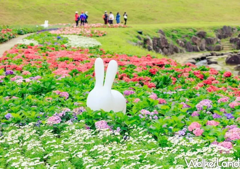 於即日起盛開的大溝溪生態治水園區繡球花花海季,有粉色、藍色和混色等近萬盆繡球花同場爭艷,利用地形高低在原有的步道旁打造愛心秀球花海,讓人近距離的走進花叢中拍出一張張美照,享受被繡球花包圍的浪漫氛圍。花叢中還藏有俏皮兔子燈藝術裝置,讓冬季花海變得更加活潑歡樂。