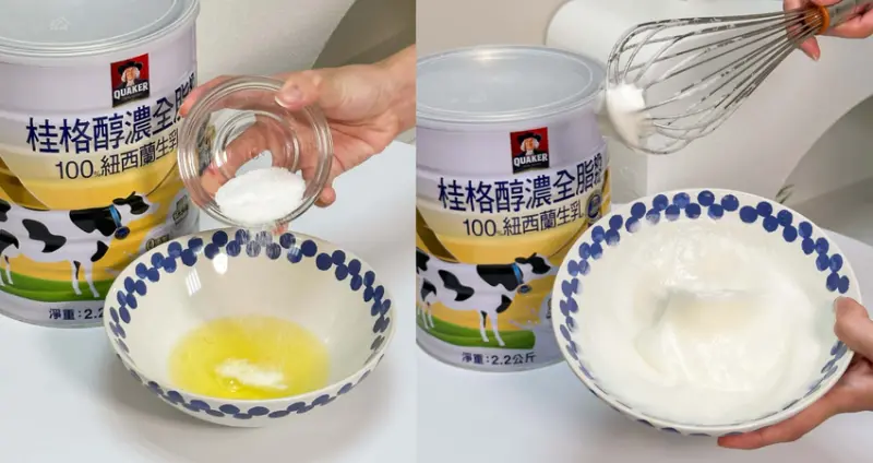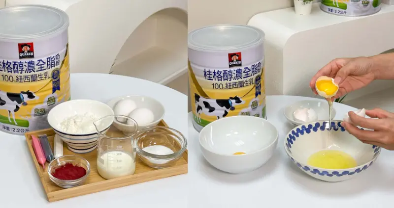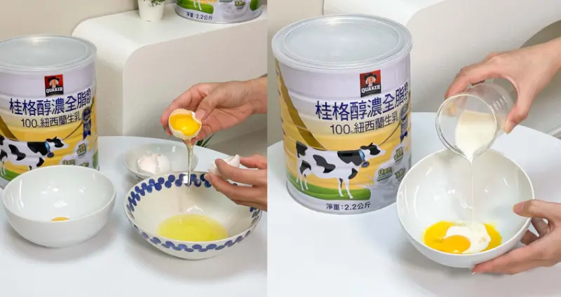 ② 取出桂格醇濃全脂奶粉,冷沖如鮮奶香醇,熱泡奶香更加濃郁,以六平匙沖泡成250毫升,再取出55毫升的牛奶,然後慢慢加入蛋黃中攪拌打發,至顏色稍微變白即可。