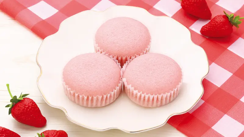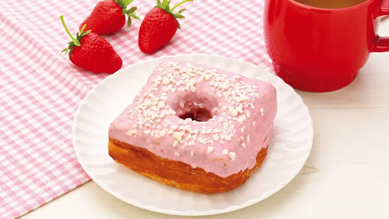 還有一款超邪惡的「草莓可頌甜甜圈」,雖然看起來是方形的甜甜圈造型,但吃起來卻是相當酥脆的層層可頌,可頌中間還填充了草莓奶油,麵包上方則淋滿了大量的草莓巧克力與白色脆餅,不用200日圓就能吃到,可說是誠意十足;蓬鬆Q彈的「草莓蒸蛋糕」也是不容錯過的復古小甜點,嚐起來濕潤柔軟,而且一份含稅119日圓就能吃3個,可說是CP值超高。
