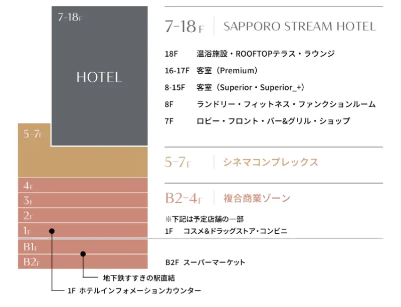 SAPPORO STREAM HOTEL就在北海道地下鐵Susukino站出來的建築物,徒步0分鐘!B2是超市,1樓則是飯店諮詢櫃台。上到7樓開始是大廳、Bar、餐廳;8樓則設有健身房、洗衣房和會議室等,公共設施完善豐富。![]()