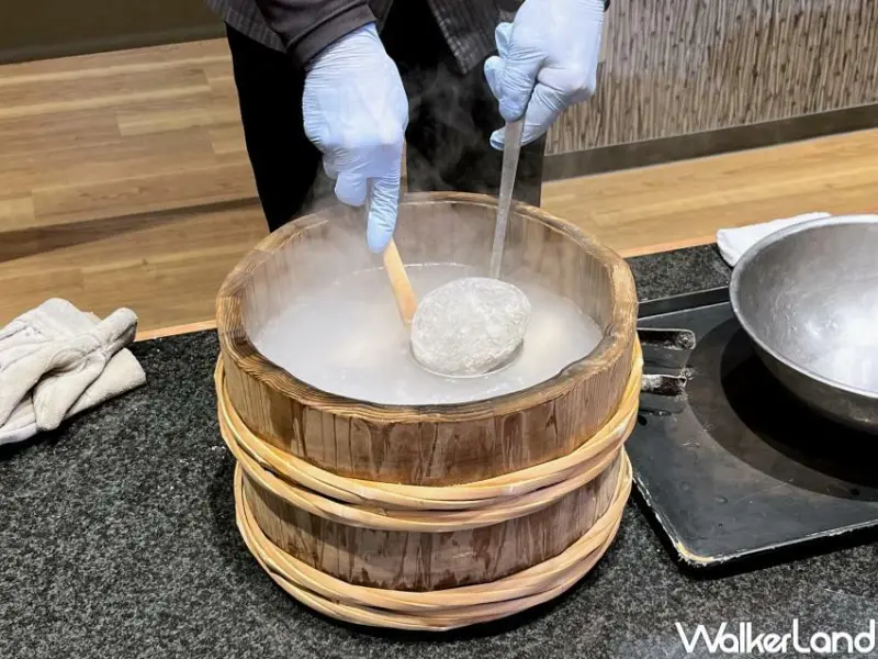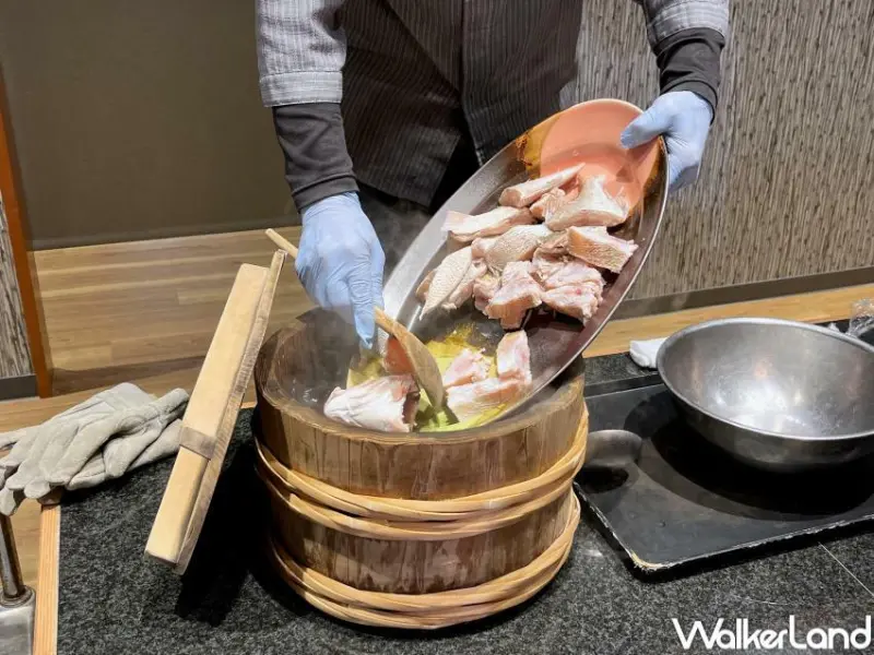 晚餐除了一道道精緻的會席料理之外,最大主角就是男鹿的在地特色料理「石頭燒味噌鮮魚鍋」,飯店的工作人員會將新鮮的魚類直接放進杉木桶當中,再以燒到近千度的石頭放入木桶,將魚肉慢慢煮滾,最後再用味噌與鹽巴簡單調味,就形成一道相當清甜又非常美味的鄉土料理。