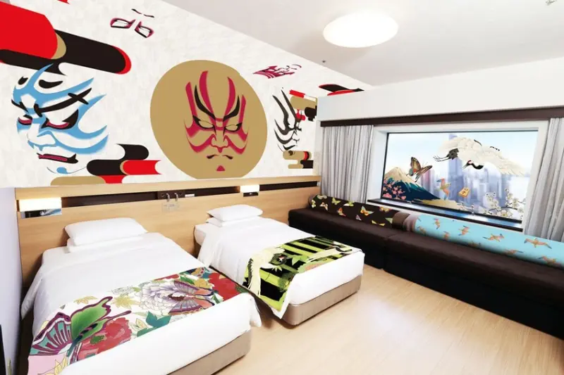 日本的歌舞伎文化享譽全球,「Hotel Metropolitan Edmont Tokyo」特別在飯店中設置了「歌舞伎概念房」,讓房間的各個角落都充滿了歌舞伎的元素,對於想要深入了解歌舞伎的外國旅客來說,可以在最輕鬆的狀態下探索,樂趣將會更加倍。歌舞伎概念房當中的最大亮點,就是以歌舞伎的獨特化妝「隈取」與歌舞伎代表作品「曾我兄弟之報仇」為主要視覺,從客房的牆壁、窗戶、床單與座椅,都擺設了相當華麗的歌舞伎元素裝飾,拍照打卡起來也特別吸睛。