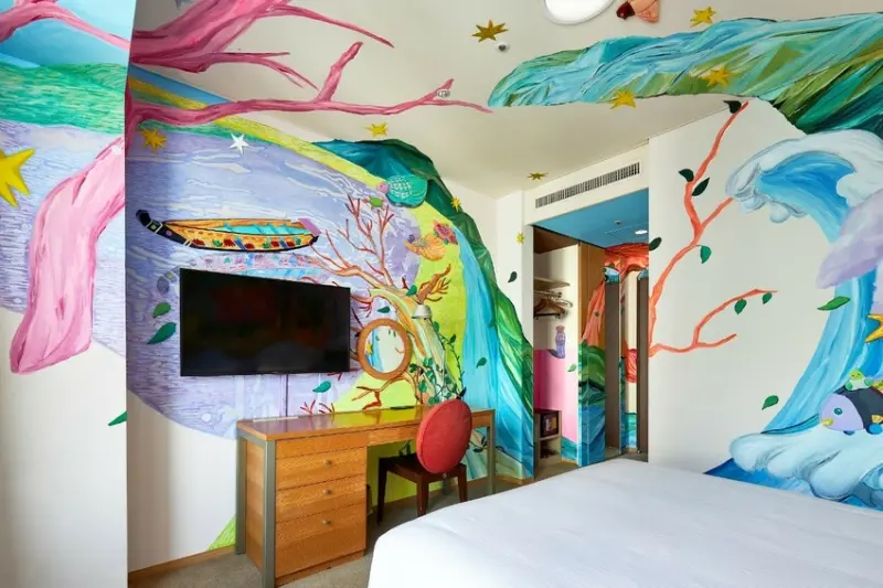 2023年11月誕生的最新藝術房型為「金太郎的大冒險」,是日本藝術家青山夢以「日本鄉土玩具的冒險」為主題所創作,房內的主視覺「金太郎抱鯉魚」其實帶有祝福孩子平安成長的寓意、「瓦猿」也含有祈福安泰之意,這些元素都經常被用來發揮成鄉土玩具的主題。除此之外,畫作甚至巧妙結合了刺繡,從床頭一路畫到天花板,視覺上極具震撼力,仔細觀察還能發現房內有各種小巧思,小心千萬不要因為欣賞過頭而忘了睡覺喔。