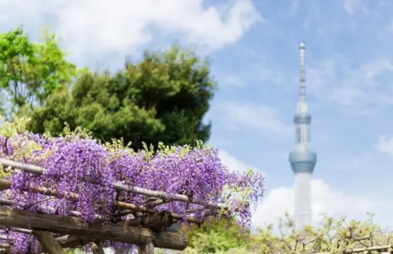 菅原道真的龜戸天神社祀著學問之神,被譽為「東京第一藤花名所」,境內約有 100株紫藤花,設有17個藤棚。紫藤花從4月中旬綻放,一邊欣賞由花棚垂下的花串倒映在心字池的美景,一邊聞著藤花所散發出的淡淡花香,令人陶醉其中。此外,從龜戶天神社還能從不同角度欣賞晴空塔,趁著花季與紫藤花和晴空塔合照吧!![]()