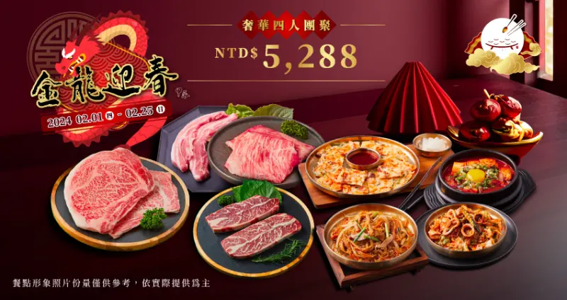 即日起至2月25日水刺床韓式烤肉餐廳,特別推出的奢華團聚四人烤肉套餐,在這場熱鬧且華麗的美食盛宴中,您將感受到王室等級的專人烤肉服務,以及釜山主廚的悉心製作的韓式小菜,更有免費續加服務,讓您的用餐體驗更加完美。