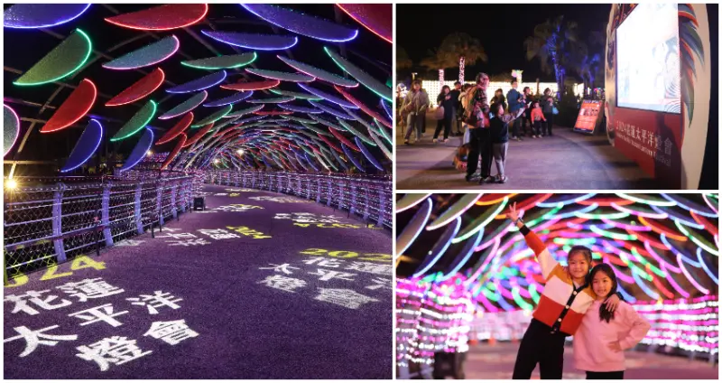 今年的科技主燈「雲龍戲珠」動畫特別邀請到科技藝術跨域知名策展人,也是花蓮子弟的林昆穎老師團隊精心策劃製作,為花蓮量身打造的3D動畫,並運用10米圓形結構及LED螢幕,結合360度旋轉噴泉及光效,氣勢磅礡,一起跟隨龍的視角,在花蓮上空自在遨遊吧!而燈會入口處的「萬燈呈瑞」燈籠牆集結了花蓮21所國小學童的創意,用純粹的祝福填滿燈籠,將1500顆手繪燈籠串聯成牆,各個匠心獨具,藉由小朋友的雙手,為花蓮點亮希望之光,聲勢浩大同時也誠意滿滿,今年春節閃耀整個太平洋公園。![]()