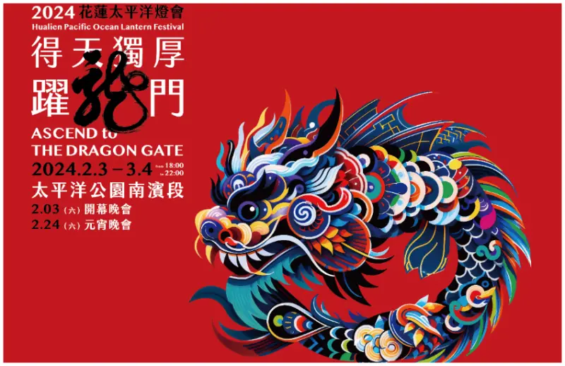 「2024花蓮太平洋燈會」即日起至3月4日於花蓮太平洋公園盛大展開,今年燈會主題「得天獨厚 躍龍門」,邀請到設計教父陳俊良做為整個花蓮太平洋燈會的藝術指導,設計靈感來自傳統文化中的故事「鯉躍龍門」,不僅融入了龍年的象徵意義,也融入鯉魚躍龍門等寓意做思考(花蓮的知名觀光景點也有鯉魚潭喔~),花蓮得天獨厚的自然和人文,獨占台灣鱉頭,豐厚的文化與歷史,是為台灣東方之珠,燈會以登龍門展現鱉龍躍動姿態,結合書法筆墨,幻化花蓮動靜兼融的能量,迎接2024年全新一年龍的年度。