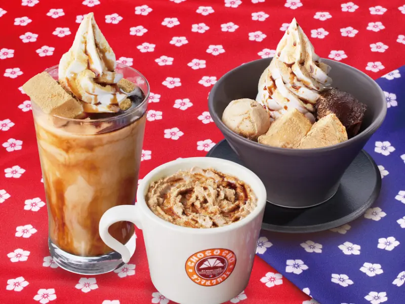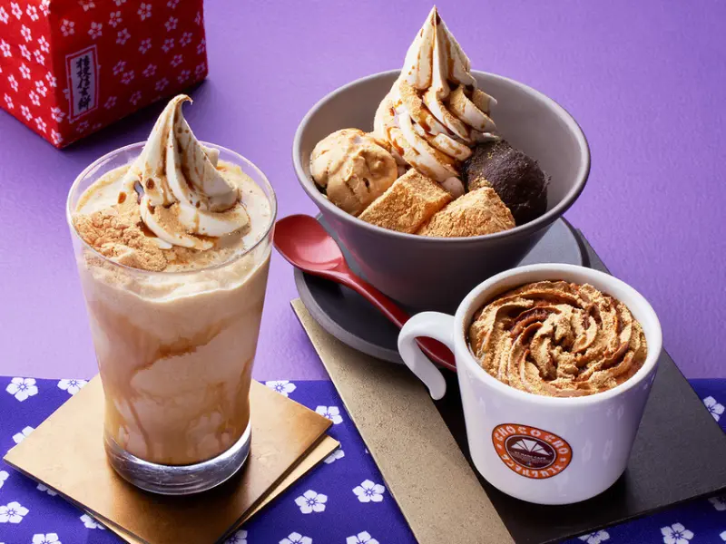 飲品的部分共有2款,分別是「黑蜜黃豆粉蕨餅奶昔」、「黑蜜黃豆粉蕨餅拿鐵」,兩者皆由沖繩黑蜜、北海道煉乳與黃豆粉製作而成,完美再現桔梗信玄餅本身濃醇的風味,一冰一熱讓大家剛好可以根據天氣或喜好,選擇喜歡的甜蜜飲品。