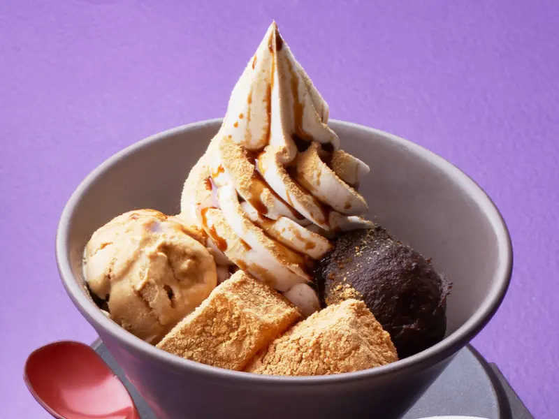 另一款重點商品「黑蜜黃豆粉蕨餅綜合聖代」則以濃厚的霜淇淋為基底,淋灑上黑蜜醬與黃豆粉,最後再以蕨餅作為點綴,就算是長輩也會很喜歡這款相當有韻味的經典日式甜點。