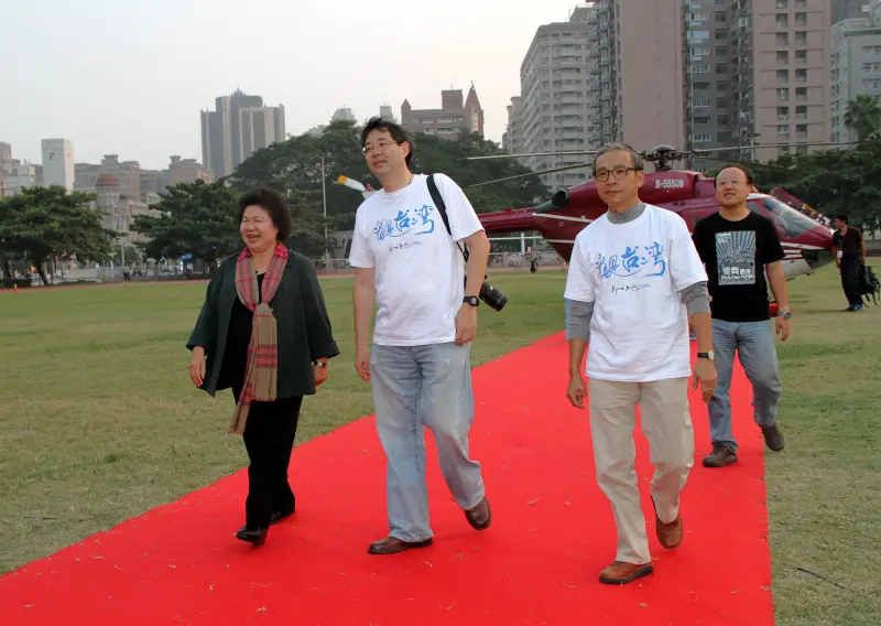 照片說明:電影《看見台灣》在高雄巨蛋首映,高雄市長陳菊(左起)、導演齊柏林以及吳念真一同搭乘直升機為片造勢。