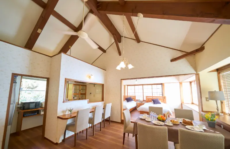 「Suite Villa 伊豆高原 Ocean Terrace」(スイートヴィラ 伊豆高原オーシャンテラス)是一棟獨棟的出租別墅。室內共3LDK,共有3間房間、一間廚房和一間餐廳,最多可容納9人入住。 ![]()