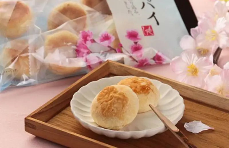 這款櫻花派(さくらパイ)將切碎的櫻花葉混入白豆餡中,包裹在酥皮中烘烤而成。櫻花餡以生紅豆餡、砂糖、水麥芽、櫻花葉、食鹽製成,其他成分包含人造奶油、小麥粉、砂糖、雞蛋、植物油脂、食鹽、脫脂奶粉和西洋酒。由於加了西洋酒,整體風味除了有著櫻花的香味,更有些成熟的酒香。日本售價為一包328日幣,含稅。 ![]()