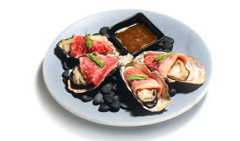 牡蠣和牛沙朗牛排卷(牡蠣の和牛サーロイン巻き)2顆2,400日圓、4顆4,760日圓,生蠔被和牛沙朗牛排包裹起來,連同殼一起蒸烤。消費者可以品嚐到牛肉的濃郁香甜和生蠔鮮美的味道。建議搭配濃郁的美奶滋一同享用。![]()