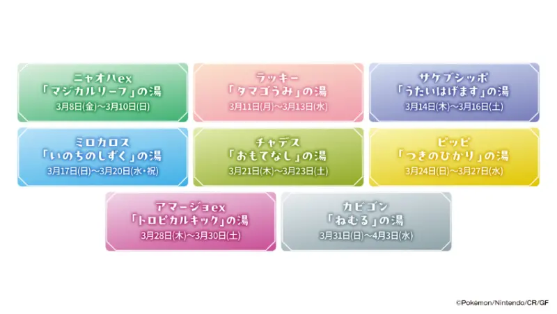 粉絲遍及全球的寶可夢,這次與極樂湯RAKU SPA集團合作,於2024年3月8日起,在其32家分店舉辦以寶可夢「治癒」為主題的特別活動「寶可夢治癒之湯」。活動將推出8種以「治癒」為主題的寶可夢溫泉,同時還有獨家設計毛巾及相關周邊商品,以及期間限定特別菜單等。