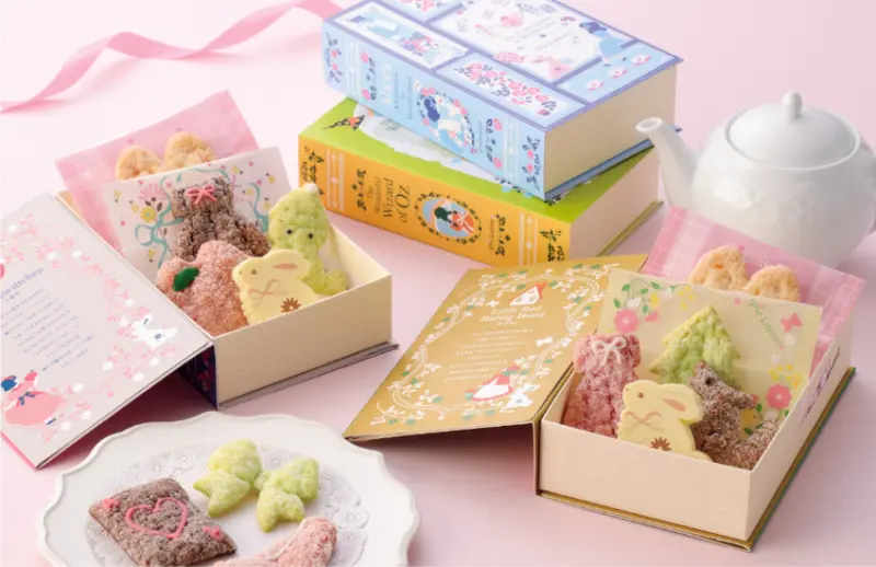 商品「甜蜜故事書」(Sweet Story Book)的包裝製作成童書的造型,故事中的主題和登場人物全都化身為可口的派餅。甜蜜故事書共有10種風格,消費者可自行挑選。造型故事書中一律有一個象徵故事導覽人的兔子巧克力,除此之外還有4種口味的派餅。派餅包含招牌「兔耳派」,還有與故事主題相關的3個造型派餅。這4種派餅的口味分別是奶油、草莓、開心果和巧克力。![]()