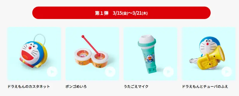 提供玩具品項:哆啦A夢響板、曼波鼓、麥克風、哆啦A夢低音喇叭