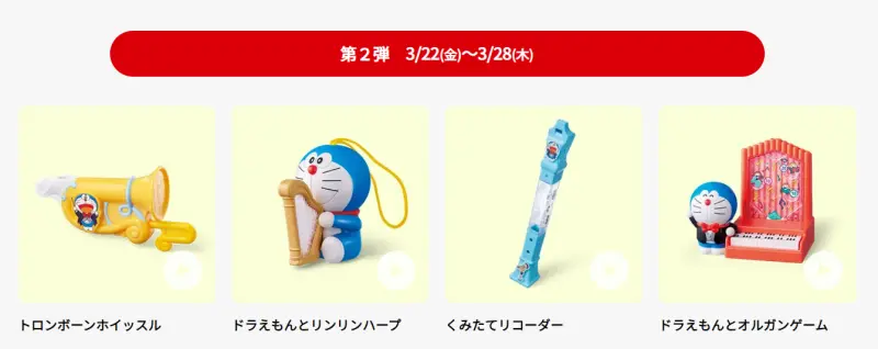 3月22日至28日登場的第二波玩具,則有「長號喇叭」、「哆啦A夢豎琴」、「直笛」與「哆啦A夢風琴」,到了3月29日的第三波活動,一口氣則會變為8款玩具隨機贈送,讓前面第一波沒跟到的粉絲們有機會能敗部復活、拿到限量登場一週的玩具,但這也代表想要抽到自己希望的款式,機率也會更小,所以建議大家在前2波就可以把握時間收藏,讓自己的哆啦A夢收藏櫃更加完整。
