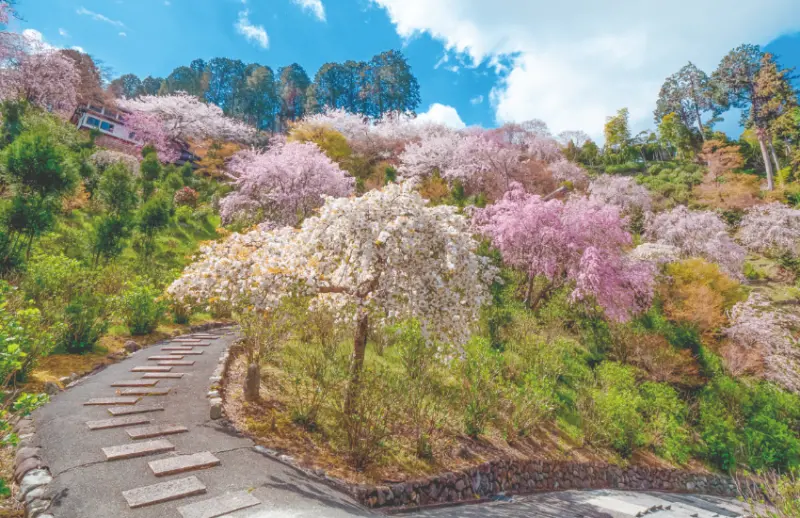 京都市西京區的善峯寺可説是賞櫻秘境中的秘境,路途遙遠,從市區搭乘大眾交通工具需約一小時,較少遊客到訪。善峯寺位處山腰,可俯瞰京都市內街景,三萬坪的境內種有百多棵櫻花樹,春季時一整面山坡都染上粉紅色,相當夢幻。另外,寺內種有一棵由桂昌院(江戶幕府將軍德川綱吉之生母)親手種植的枝垂櫻,歷時300年仍然每年綻放。由於這裡的櫻花品種眾多,包括山櫻、彼岸櫻、牡丹櫻等,開花時間稍有落差,所以從4月上旬到下旬都可以欣賞到茂盛的櫻花美景。![]()