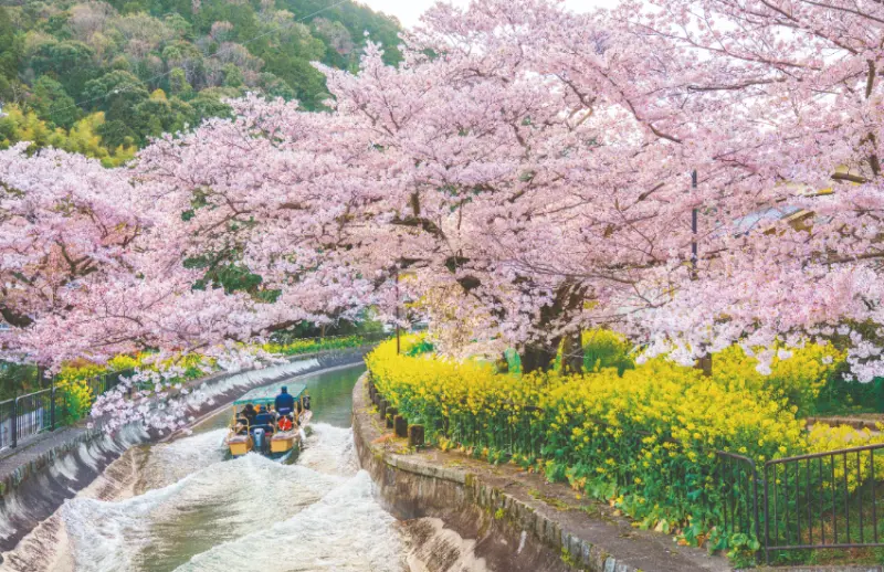 河川旁邊的櫻花樹與水面上的倒影相互輝映,形成夢幻景致,讓人沉醉不已。如果再加上其他花卉點綴,繽紛色調洋溢春天氣息!山科疏水是將滋賀琵琶湖引水進入京都市的水道,兩旁種滿淡粉紅色的染井吉野櫻和鮮黃的油菜花,每逢春季就成為當地人必訪的賞花景點。編排行程時建議提早出發先來這裡,人流較少,可短暫獨享這片浪漫花海。如果想從水道抬頭賞櫻,可乘坐琵琶湖疏水船遊河,從不同視角觀賞滿開的春櫻。![]()