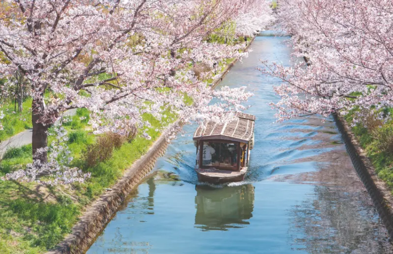京都市的伏見區除了是有名的酒鄉,古代還是河運相當發達的水鄉。戰國時代,伏見已發展出四通八達的水路,是當時主要的交通要道,同時也用來運送貨物,包括酒製品及其原料。時至今日,遊客仍然有機會搭乘江戶小舟,欣賞河畔的櫻花。小舟有「十石舟」和「三十石船」兩款,十石舟行駛的水道路程可觀賞到較多的櫻花,是搭乘體驗的首選。十石舟的搭乘位置在製酒公司「月桂冠」大倉紀念館的後面,上船後除了賞櫻,沿岸的垂柳也是一大賣點。花季的中後期,櫻花花瓣點綴水面,更添夢幻!整個船程約為50分鐘,中途會在三栖閘門(水閘)停船,有15分鐘可下船參觀資料館,認識治水歷史。![]()