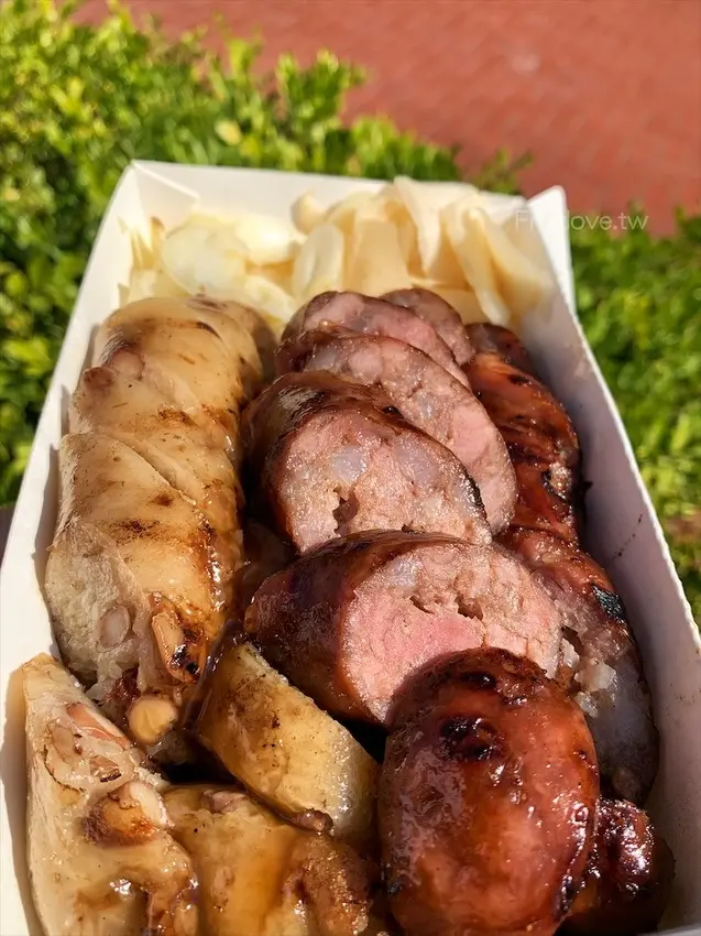 在地人氣很旺的炭烤大腸加香腸美食,完美的黃金比例,鮮嫩帶有肉汁的口感,配上蒜片一口一個超級對味,糯米腸裡有包入花生,還有嫩薑片可以一起搭著吃,加上碳烤後的香味讓我們吃得好滿足…<全文介紹>