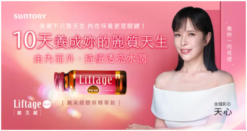 被粉絲暱稱「童顏女神」的金鐘影后天心,即使出道30年,時間完全沒有在她臉上留下任何痕跡,讓美麗永遠保鮮的秘訣就是:三得利『麗芙緹』膠原精華飲。天心認為女人除了外在擦的保養品外、內在保養調理打造好基礎更是不能少,尤其長時間拍戲、跟老公台灣韓國兩邊飛,特別忙碌、睡眠不足,三得利『麗芙緹』膠原精華飲成為她「喝」的青春露,尤其用來急救保養超有感,隨時都能呈現飽滿透亮,麗質天生的好狀態!![]()