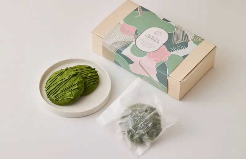 這款軟餅乾名為朦月,每片使用約2克宇治抹茶。無麩質,散發著白巧克力的甜味、抹茶的苦味和少許的鹽味,具層次感。5入套組 2,280日圓,12入套組 5,180日圓,含稅。