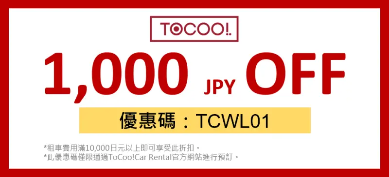 開始介紹之前!ToCoo!租車網要送給Walker會員小禮物,無論你是要規劃出國自駕,或是有家人準備要出國,只要點進下方連結,輸入優惠碼 TCWL01 就能領取滿10,000日元折抵1,000日圓的抵用金,快收藏起來好好規劃一趟屬於你的自駕旅吧。