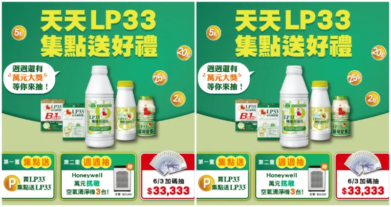 現在買還可直接參加《天天LP33,集點送好禮》活動,即日起至6/2(日),到各大通路購買LP33貼標產品,憑活動貼紙序號登入活動網站集點,就有機會免費帶回價值千元的LP33益生菌膠囊,買越多換越多!![]()