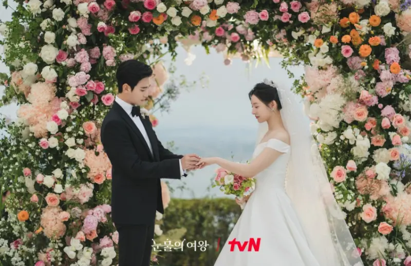 《淚之女王》致敬「迫降CP」,金智媛與金秀賢在劇裡的婚紗照,靈感就是源自當年兩位巨星結婚的盛況,新娘露出雪白酥肩、鎖骨,披上白色長紗,新郎戴著黑色蝴蝶結、高腰西裝褲,高度還原效仿玄彬、孫藝真的婚禮裝扮,就連背景的白花、粉紅,都是當年兩人結婚典禮上的佈景,令粉絲嗨翻。![]()
