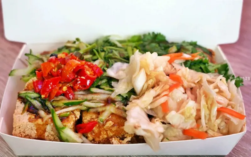 這泡菜給的超多超爽快,香菜、小黃瓜、辣椒也都把臭豆腐給淹沒了。或許也是因為這樣,所以這家臭豆腐著重的不是酥脆口感,重點在爆汁啊。<全文介紹>
