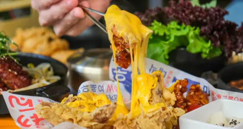 紫菜飯卷不同於傳統吃法,飯的部分有混黑醬或是紅醬可以選擇,整體香氣更佳。必點韓式手抓飯糰也不能錯過,滿滿海苔和韓式麻油超涮嘴。韓國人最正宗的吃法,除了單吃燉雞之外,不管是什麼附餐、配料通通都沾燉雞的醬吃。吃剩後,再加點一碗白飯和剩下的燉雞醬拌一拌,又是第三吃。一趟吃下來三種滿足超過癮。