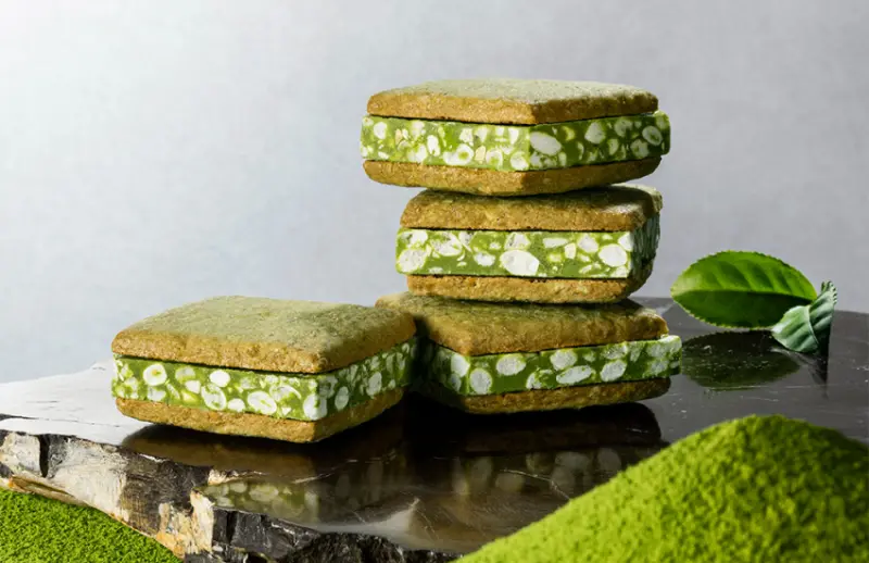 嚴選矢野園的宇治抹茶所製作的「抹茶巧克力夾心餅 茶之福(お抹茶ショコラサンド 茶の福)」。在酥脆的餅乾融合了宇治抹茶及夏威夷果仁,打造多層次的風味。中間夾入的厚切宇治抹茶巧克力,混合了米餅、杏仁及核桃等。輕嚐一口,即可感受到抹茶的濃厚滋味與香氣,以及豐富內餡帶來不同層次的口感。