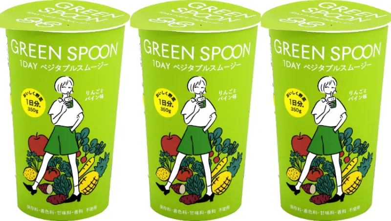蔬菜果昔包含了一天份所需(相當於350克)的蔬果。原料共有21種蔬菜和3種水果,味道是清爽的水果味,害怕果菜汁味道的人也能輕易嘗試。使用的蔬菜和水果包括:黃色胡蘿蔔、甘藷、番茄、羽衣甘藍、芹菜、香菜、捲心菜、菠菜、青紫蘇、小松菜、大根、茄子、白菜、彩椒、艾草、萵苣、花菜、綠蘆筍、西洋菜、小蘿蔔、三葉草、蘋果、檸檬、鳳梨。價格238日圓(含稅)。![]()
