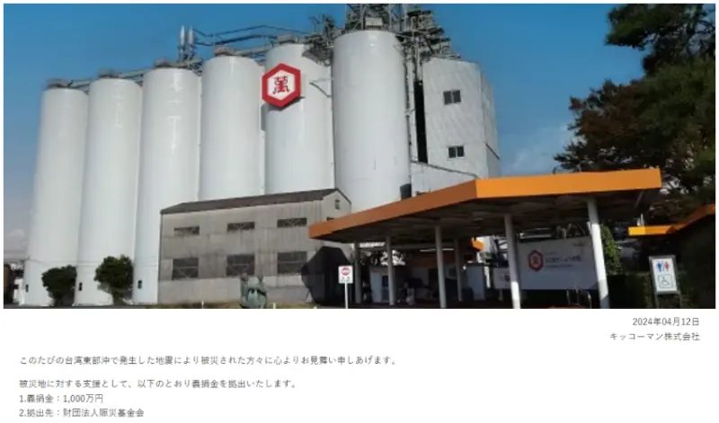 花蓮4月3日發生地震全台有感,特別是花蓮地區受災情況嚴重,各界紛紛伸出援手,希望能協助災區居民盡快重建家園,日本龜甲萬株式會社也表達了對受災戶的深切慰問。日本龜甲萬株式會社於12日公告:針對最近在台灣東海岸發生的地震中受災戶致上最深切的慰問,「龜甲萬株式會社作為對災區的支援,決定向財團法人賑災基金會捐款1000萬日圓」,展現了台灣與日本之間深厚的友誼和相互扶持的精神,期盼受災者能盡快恢復正常生活。![]()