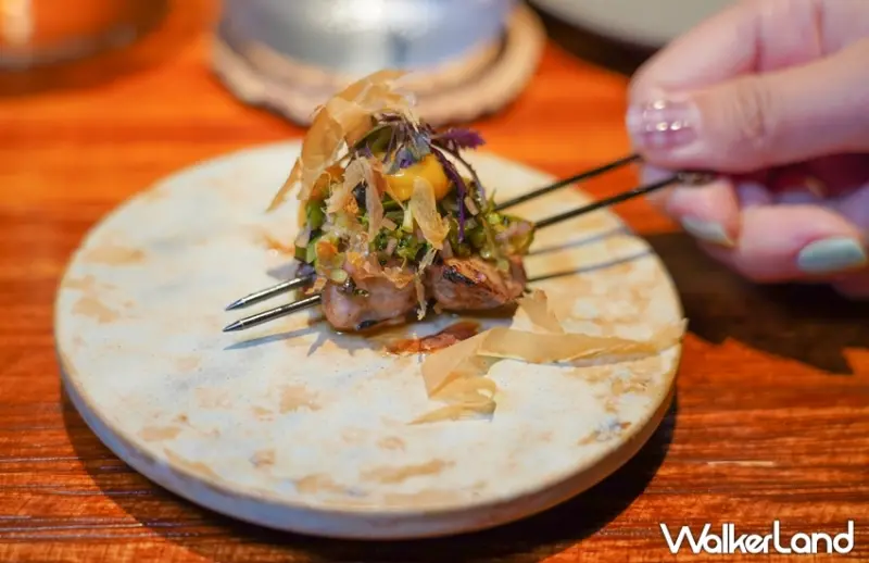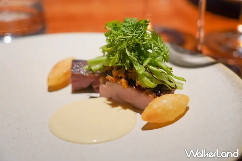 還有「小羊胸腺/青龍椒/花椰菜」選用炭火燒烤來自紐西蘭的小羊胸腺,接著使用台灣醬油與椪醋調味,搭配炭烤的青龍椒、花椰菜、柴魚片,喚醒日式燒烤(或章魚燒)的飲食記憶,感受卻截然不同,而香氣主要源自煙燻蛋黃醬汁。