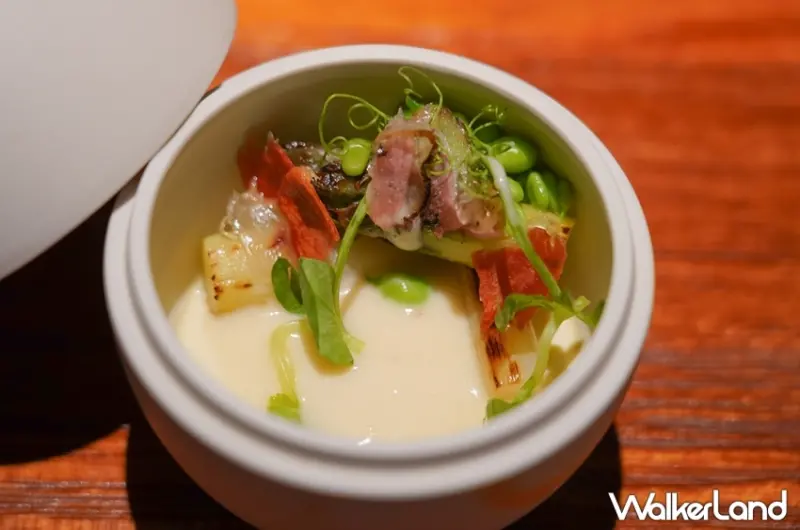 第三道前菜 「蘆筍/金華火腿/甜豆」以湯中之王「醃篤鮮」為靈感,蘆筍蒸蛋沈浸於以老母雞、薑、金華火腿熬製的醬汁中,搭配來自嘉義的紫蘆筍、碗豆仁,以及西班牙火腿和主廚自製醃燻彰化櫻桃鴨胸。將所有食材一起食用,感受如布蕾般細緻絲滑的口感,同時還會有鴨胸與火腿鹹香滋味。