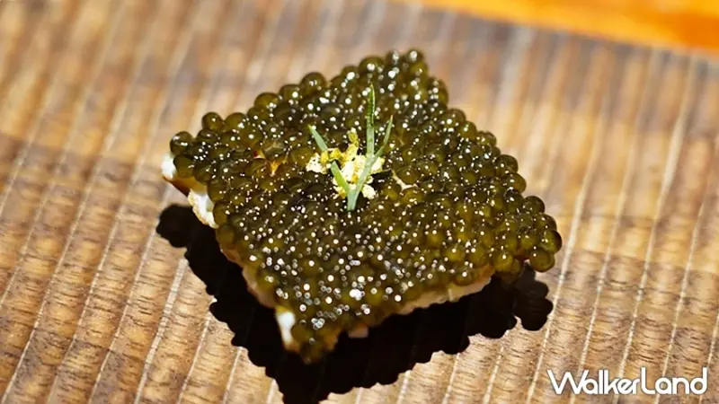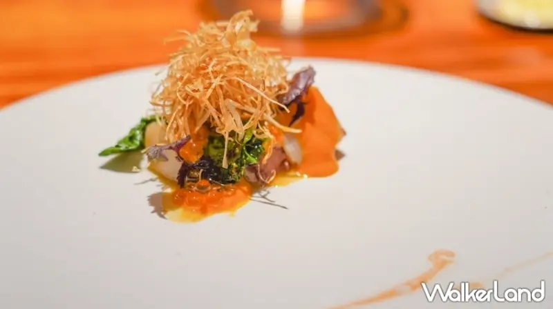 「干貝/章魚/海膽辣醬」則是以炭燒手法呈現章魚及北海道干貝,淋上以海膽、辣椒、紅蘿蔔、紅椒熬製成海膽辣醬,再加上芥藍菜、紅紫蘇葉及炸大蔥絲。建議食材與鮭魚卵一同入口,瞬間可以感受到鮭魚卵爆開的鮮味,以及濃郁又帶點辛辣的海膽氣息。