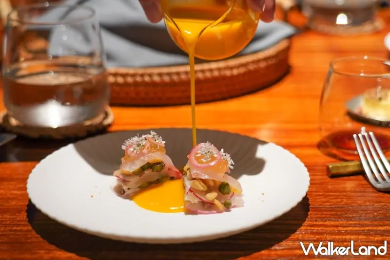 前菜部分, 「白甘/蕪菁/南瓜」選用當季肥美的白甘魚肉,夾層以酸豆、松子、蕪菁、櫻桃蘿蔔來豐富口感,魚肉上方的半透明杜松子梅酒果凍、香菜花,揉合出明顯的酸味曲線層次,淋上南瓜油醋醬汁與抹上打碎鯷魚的白甘魚肉一同享用,在鯷魚的一絲鮮味中,以南瓜甘醇風味與油醋的酸感體現白甘優雅的甜美滋味。