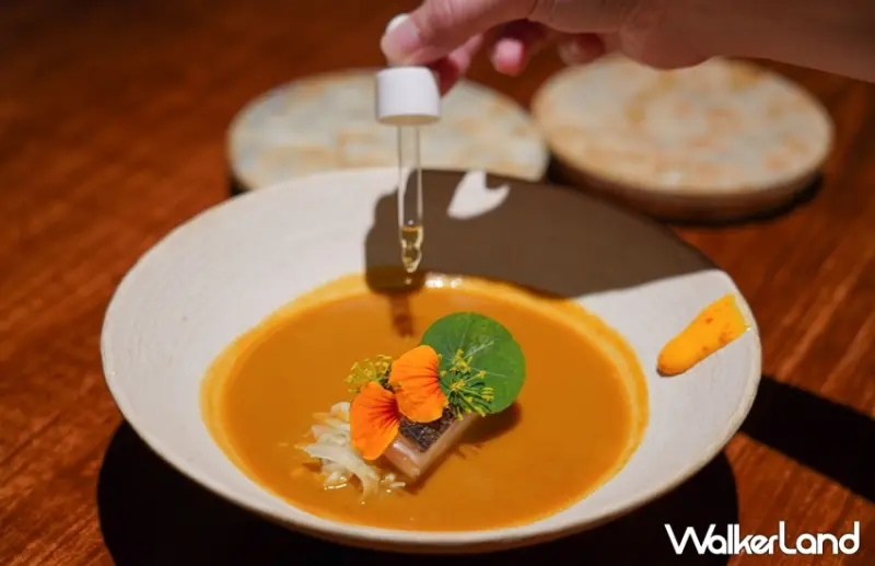 海鮮 「海鱺魚/馬賽魚湯/茴香頭」選用狗母魚、梭子魚、角魚等台灣魚貨及蝦蟹甲殼類,經過長時間熬煮,中央以炭烤半熟成的澎湖海鱺魚肉為主體,下方以茴香頭及蛤蜊肉襯底,上方綴飾金蓮葉、金蓮花與茴香花。馬賽魚湯有三種品嚐方式:直接品嚐濃鮮原味;將盤上的大蒜美乃滋融入湯中,喝起來更加香濃;最後加入少許茴香酒來提升層次。