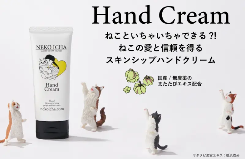 這款護手霜添加了貓咪喜歡的木天蓼精華,同時也保證不添加任何有害的危險成分。透過這項商品,使用者可以迅速獲得貓咪的愛與信任,也能夠輕易地和貓咪擁有親密接觸。在2023年11月6日時,這項商品正式登上日本的群眾募資平台Makuake,最終募資結果遠超登出預定金額的30倍,一共募得3百多萬日幣!香味是奇異果香,而木天蓼來自由日本佐賀縣的身心障礙人士就業持續支援企業,栽種和採收的過程都由身心障礙人士所進行,具有社會公益的意義。抹上這款護手霜,除了可以「吸」貓,還能去除手指和指甲的角質,保濕並潤平肌膚。