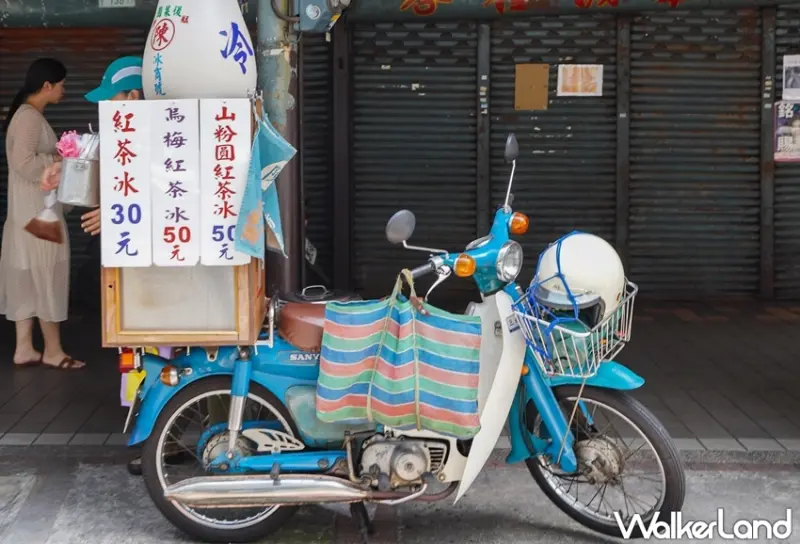「陳冰商號」的「攤車」實際上是一輛水藍色的三陽美力,茶桶置於檔車後方架著的木質櫥櫃之中,櫃子掀蓋則巧妙地化身紅茶冰裝袋的工作檯。每次出攤供應三款紅茶冰,當天會在官方FB和IG公告菜單。基本上都是原味再搭配兩種口味的紅茶冰,例如:山粉圓、烏梅、鹹楊桃等,也會推出季節限定的芒果紅茶冰;偶爾,會全面供應綠茶或奶茶,或是在寒冷的天氣提供熱飲。